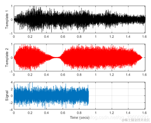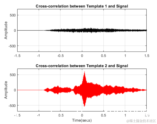 第一个子图表示信号与模板1的相关性较低,而第二个子图中的高峰值表示信号存在于第二个模板中。