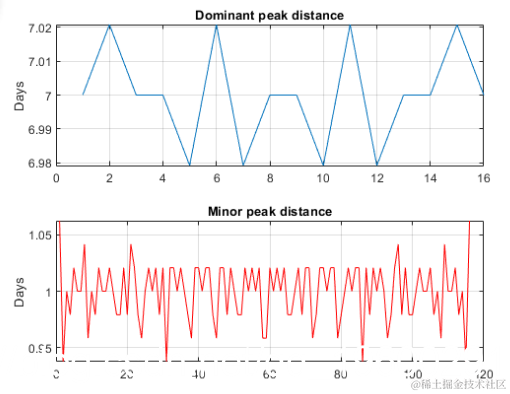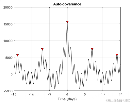 观察自协方差的主要和次要波动。主峰和次峰出现等距。要验证它们是否正确,请计算并绘制后续峰位置之间的差异。