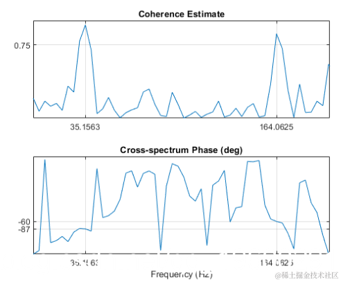 计算两个信号之间的频谱相干性。 确认sig1和sig2在35 Hz和165 Hz附近具有两个相关分量。在频谱相干性很高的频率中,可以使用互谱相位来估计相关分量之间的相对相位。