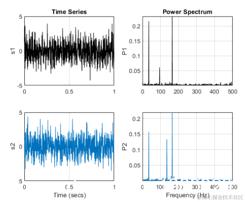 功率谱显示每个频率中存在的功率。频谱相干性识别信号之间的频域相关性。趋向于0的相干值表示相应的频率分量是不相关的,而趋向于1的值则表示相应的频率分量是相关的。