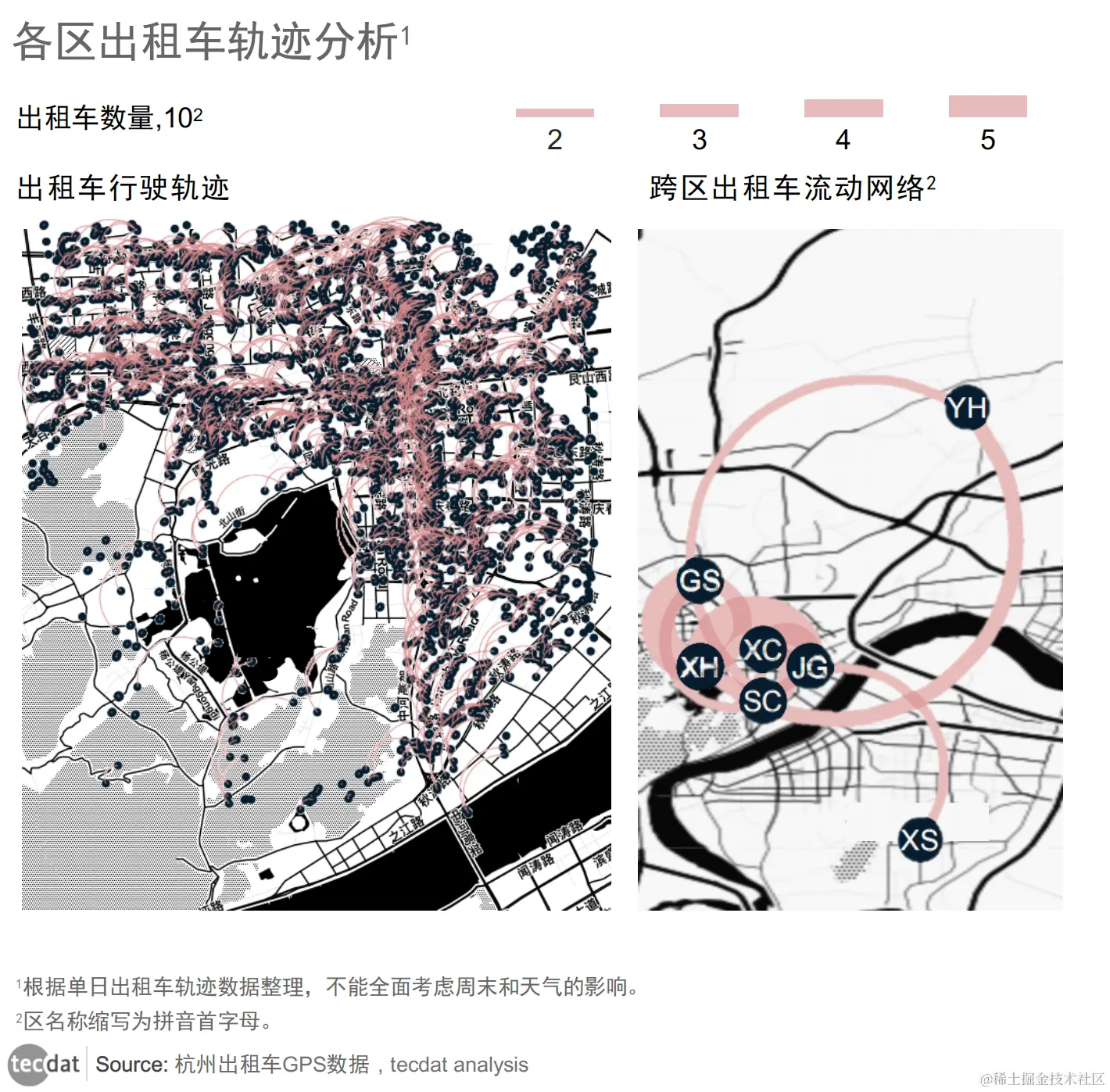 西湖区、江干区、拱墅区和下城区是出租车最密集的区域。