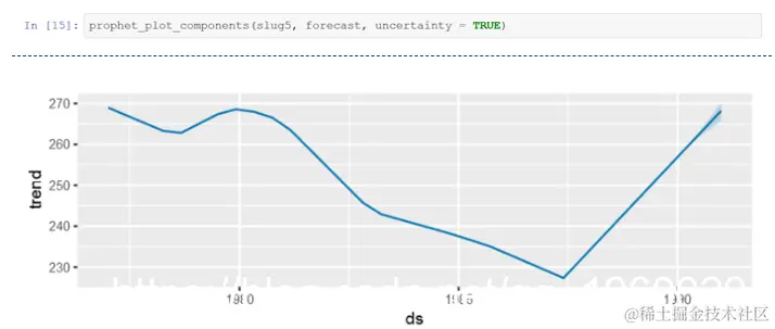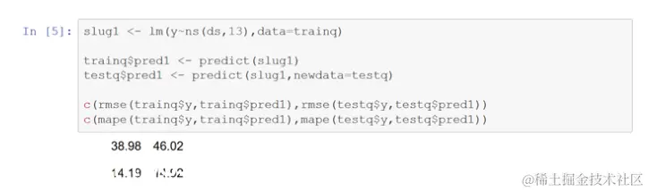 现在开始拟合基本的lm线性模型。第一个回归整数日期(ds)的三次样条上的日出生(y)以捕获趋势。根据训练和测试数据计算rmse和mape。