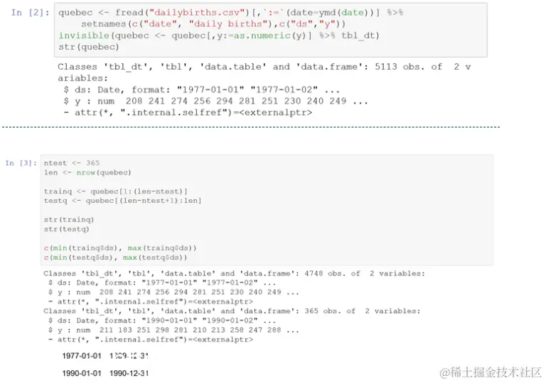 读取魁北克的出生文件,建立一个data.table 。创建培训和测试data.tables-使用前13年的每日数据进行培训,并使用第14年进行测试。
