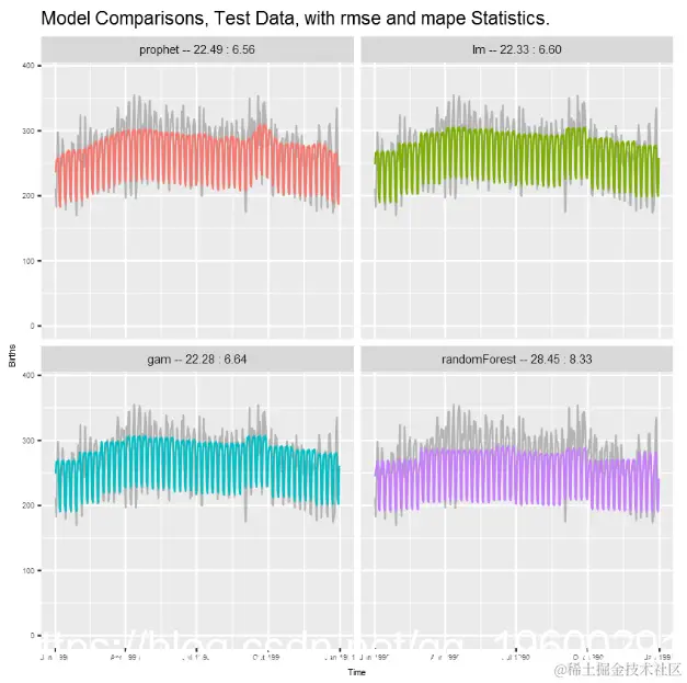利用这些特定的数据,先知,lm和gam模型的测试预测非常相似,并且优于randomForest。