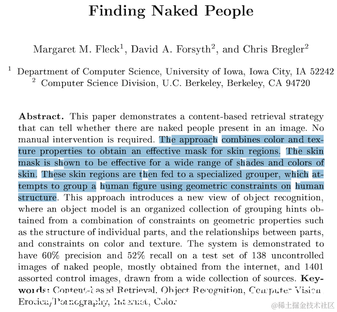 该领域的开创性著作是Fleck等人的恰当命名为“ Finding Naked People”。它于90年代中期出版,为计算机视觉研究人员在卷积网络接管之前进行的这类工作提供了一个很好的例子。