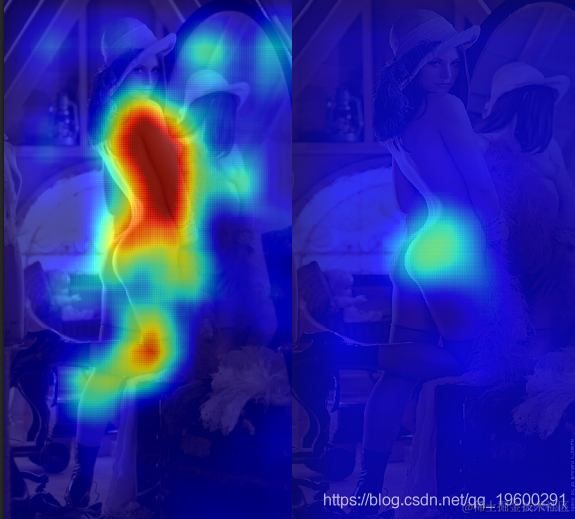 为了在左侧建立热图,我们将每个窗口发送到convnet并平均每个像素的“ NSFW”得分。当卷积网看到作物充满了皮肤时,往往会预测为“ NSFW”,这会导致莉娜身体上的大红色区域。为了在右侧创建热图,我们系统地遮住了原始图像的一部分,并报告1减去平均“ NSFW”得分(即“ SFW”得分)。当大多数NSFW区域被遮挡时,“ SFW”得分会增加,并且我们会在热图中看到更高的值。为了清楚起见,下图举例说明了上述两个实验分别将哪种图像馈入卷积网络: