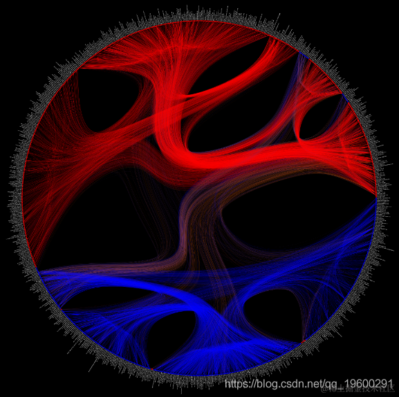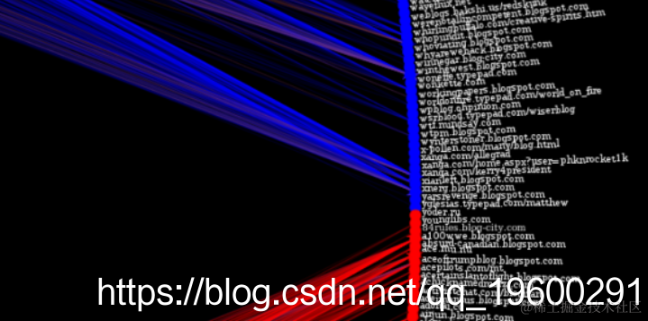 这是“2004年大选”中的博客网络图,但是边缘束是使用随机块模型确定的(注:下图与图相同(即,布局和数据相同))。 Tiago论文中的5-我只是在上面放了一个黑色背景 。