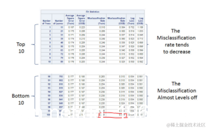 在下表中分析森林时,我们可以看到误分类率已经达到了最低点,这表明在OOB样本中使用该模型进行测试时,误分类率仅在22%。