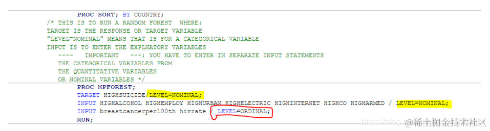 为了在SAS中运行随机森林,我们必须使用PROC HPFOREST指定目标变量,并说明天气变量是“类别”还是“定量”。为了进行此分析,我们使用了目标(Repsone变量),该目标是分类的(SAS语言中标称的),如下面的图像代码中所描述的黄色和红色: