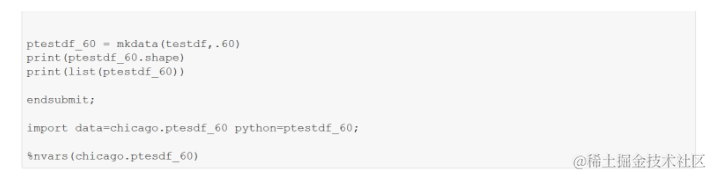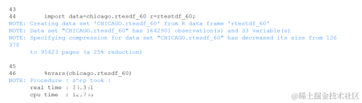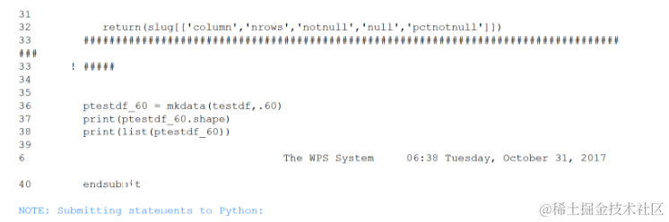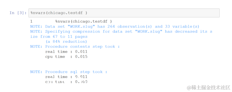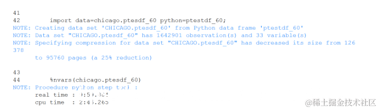 接下来,将SAS数据集导出到Python pandas,然后部署Python函数以确定每列中的%notnull并创建一个新的pandas数据框,其中只有%notnull超过.6的列。经过Python处理后,将pandas数据框导入SAS。与R一样 。这个单元比上一个单元耗费了一个数量级的时间。