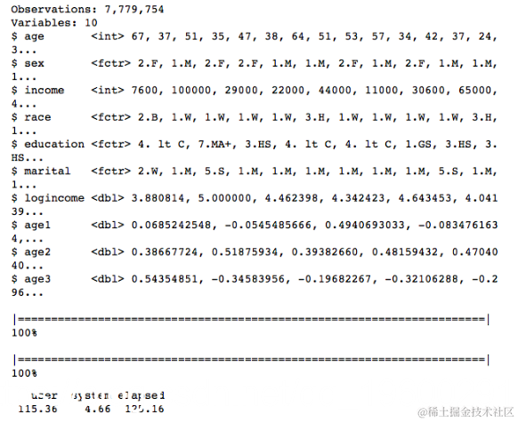 现在加载并子集用于建模练习的数据。 有8,644,171个案例和7个属性。