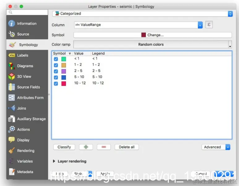 关闭属性表并Properties>Symbology为该seismic图层打开。Categorized从顶部的下拉菜单中选择,这是根据分类变量的值为数据着色的选项,然后ValueRange在下选择Column。