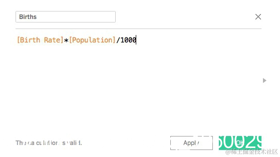 数据包含给出出生和新生儿死亡率的变量,但没有给出必须计算的出生和死亡总数的变量。在顶部菜单中,选择Analysis>Create Calculated Field。如下所示填写对话框(只需开始输入变量名以选择要在公式中使用的变量名):
