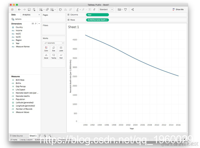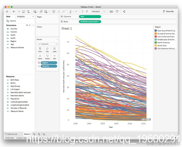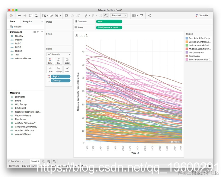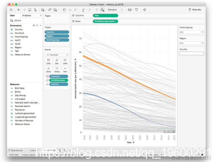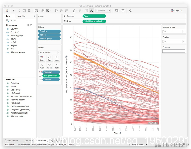 跨国家加价是没有道理的。而且,我们对各个国家的新生儿平均死亡率或中位数没有兴趣。相反,我们希望每个国家/地区有一条线。所以拖动Country到Detail在Marks货架:
