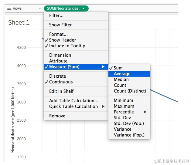 Tableau通过使用函数将每年每个国家的费率相加来汇总数据SUM。您可以通过打开中的变量菜单来更改摘要功能Rows,如下所示: