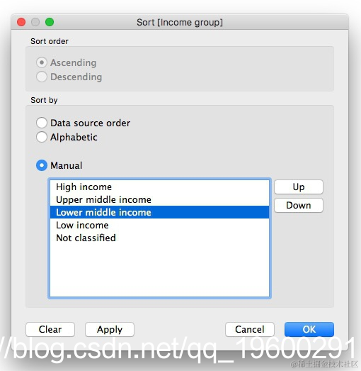 Income group过滤器将按字母顺序列出选项,而不是按收入顺序列出,这样更有意义。要解决此问题,请Income group在Data面板中右键单击并选择Default Properties>Sort。在下面的对话框中,选择Manual排序,如下编辑顺序,然后单击OK: