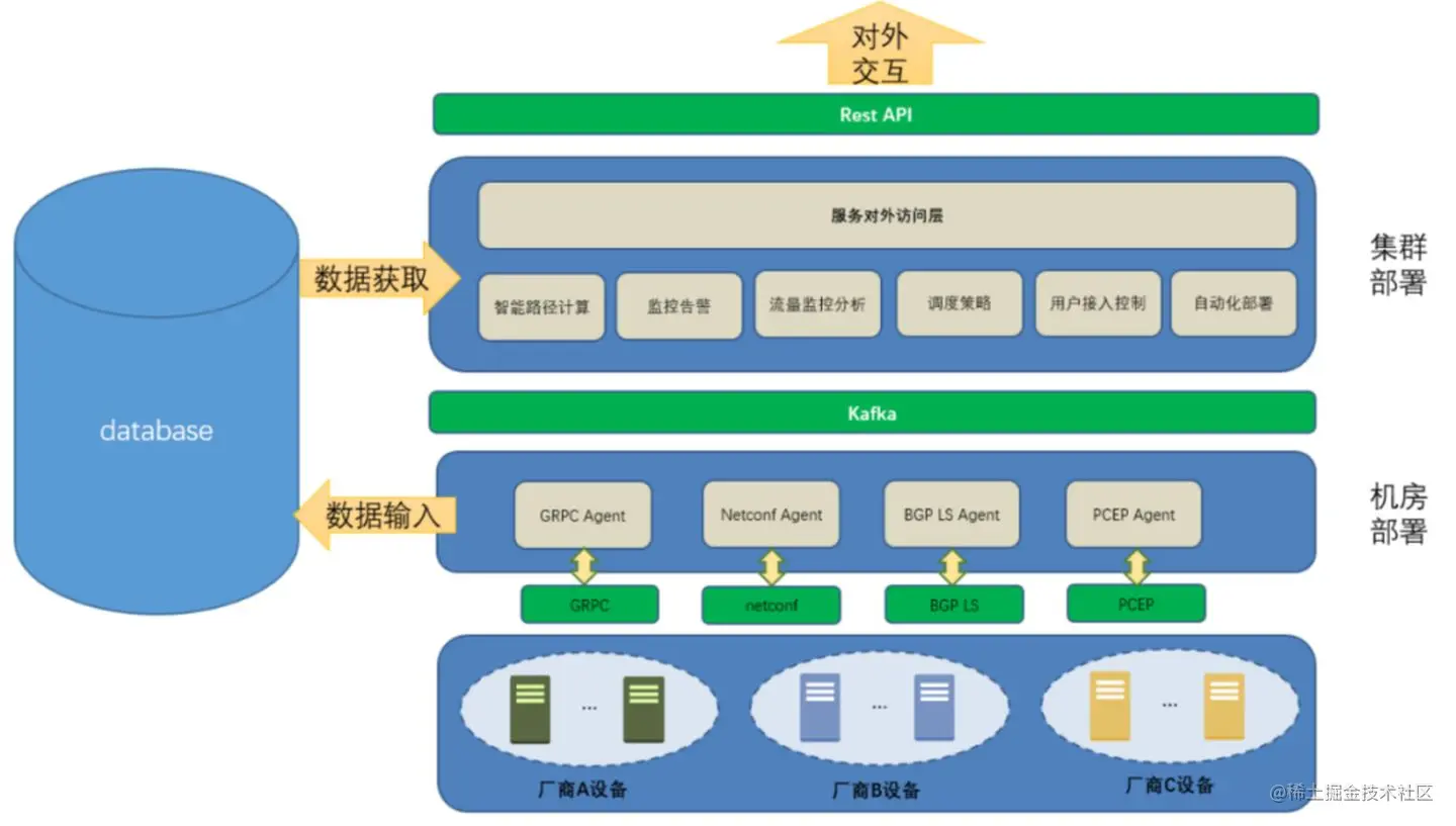 **控制器:**对全网转发PE、CPE、VPE等设备进行统一的资源管理、信息收集、配置下发,监控告警以及路径计算规划,实现全网资源的统一调度和管理。