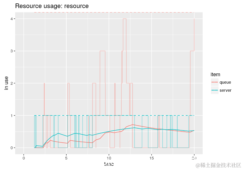 例如, 可以快速可视化随时间变化的资源使用情况。在下面,我们可以看到仿真如何收敛到系统中理论上的平均客户数。