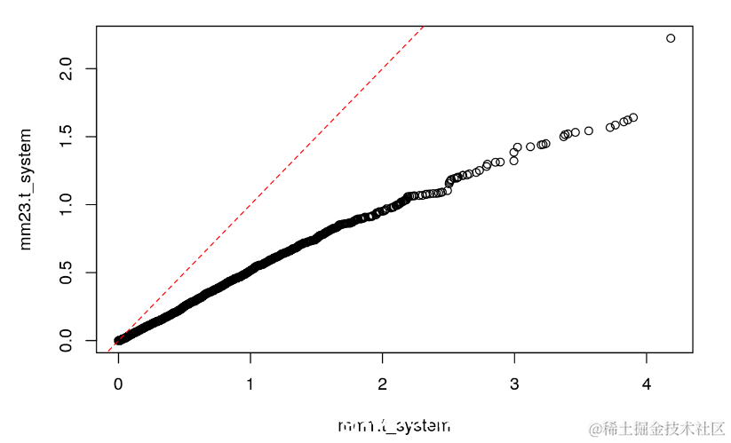 qqplot(mm1.t_system, mm23.t_system)