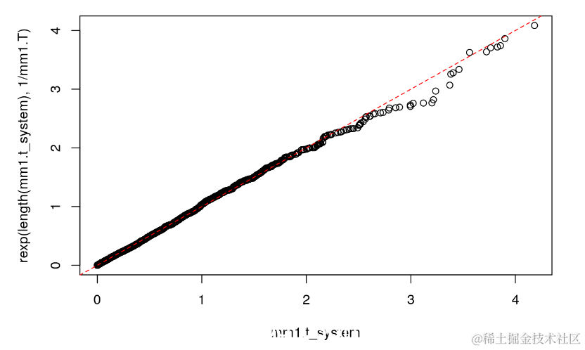 qqplot(mm1.t_system, rexp(length(mm1.t_system), 1/mm1.T))
