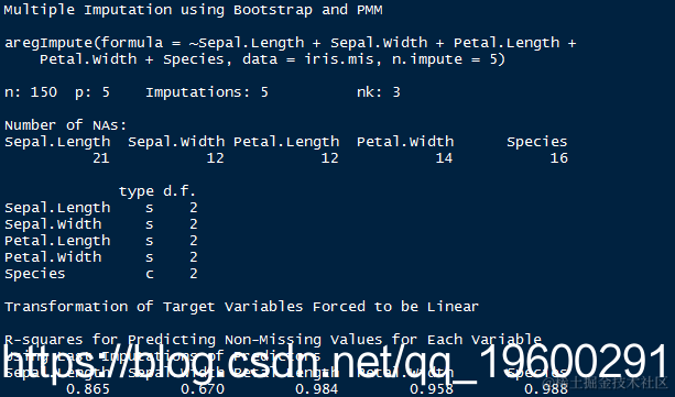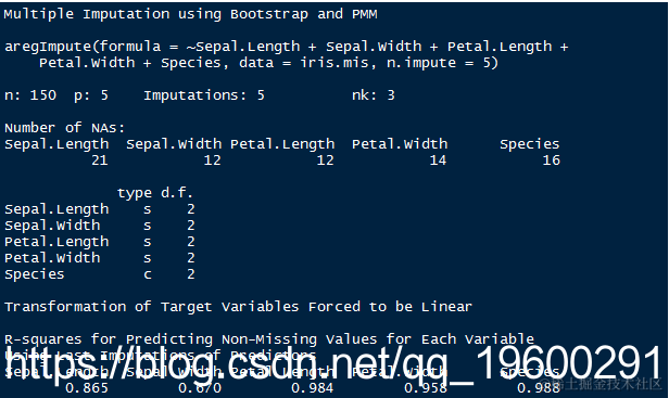 输出显示R²值作为预测的缺失值。该值越高,预测的值越好。您还可以使用以下命令检查估算值