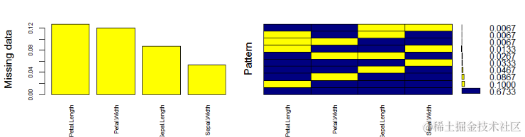 让我们快速了解这一点。数据集中有67%的值,没有缺失值。在Petal.Length中缺少10%的值,在Petal.Width中缺少8%的值,依此类推。您还可以查看直方图,该直方图清楚地描述了变量中缺失值的影响。