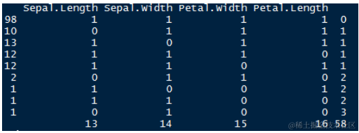 让我们了解一下这张表。有98个观测值,没有缺失值。Sepal.Length中有10个观测值缺失的观测值。同样,Sepal.Width等还有13个缺失值。