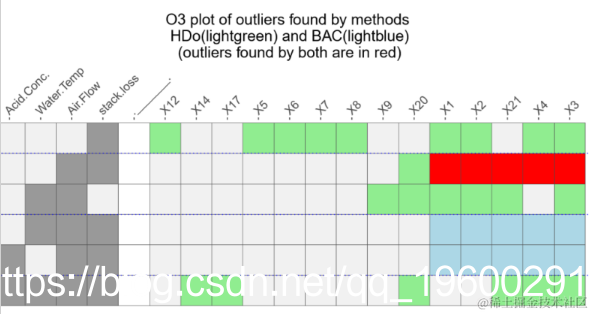 Stackloss数据集的O3图。每个变量组合(由左边的列定义)一行,找到了异常值,并将每个案例的一列标识为异常值(右边的列)。