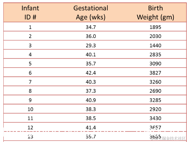 我们希望估计胎龄与婴儿出生体重之间的关系。在这个例子中,出生体重是因变量,孕龄是自变量。因此y =出生体重和x =胎龄。数据显示在下图中的散点图中。