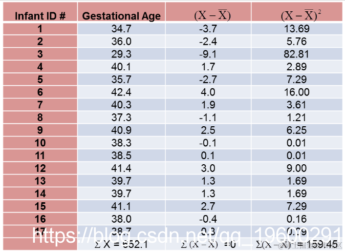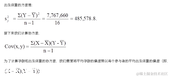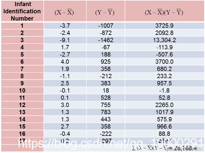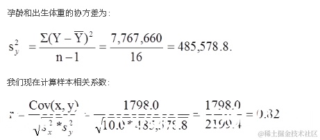 计算总结如下。请注意,我们只是简单地将平均孕龄和出生体重的偏差从上表中的两张表中复制到下表中并进行相乘。