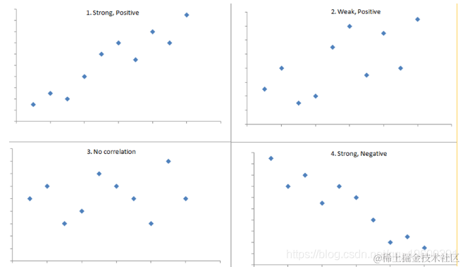下图显示了四个假设情景,其中一个连续变量沿着X轴绘制,另一个沿着Y轴绘制。