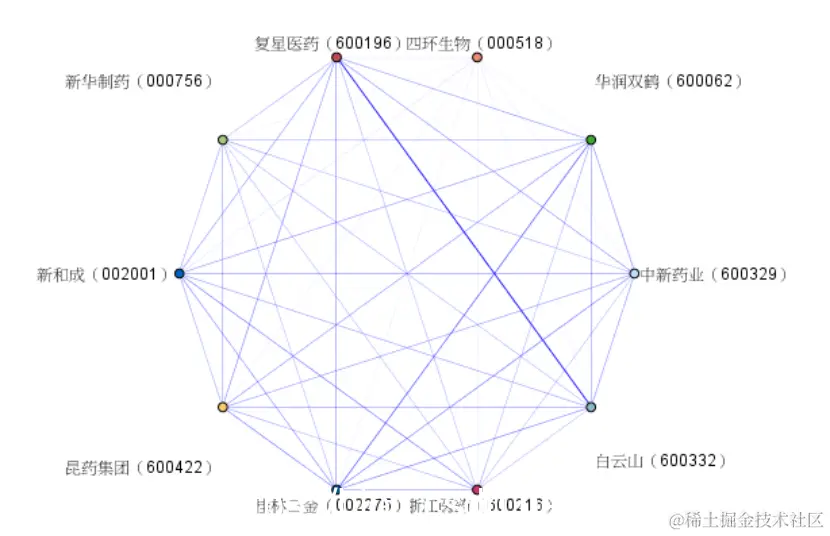 线段的粗细程度由线段两端点的股票的价格同时上涨的天数决定,如果线段两端的股票的价格同时上涨的实际情况的频数越大,那么链接两只股票间的线段就越粗。如果线段两端的股票的价格同时上涨的实际情况的频数越小,那么链接两只股票间的线段就越细。从这一图中很明显的可以看出复兴医药和白云山之间有着很强的关联。