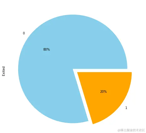 以下脚本绘制该Exited列的饼图。