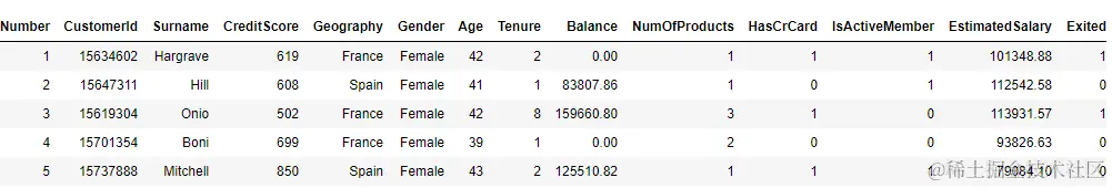输出显示该数据集具有1万条记录和14列。我们可以使用head()数据框的方法来输出数据集的前五行。