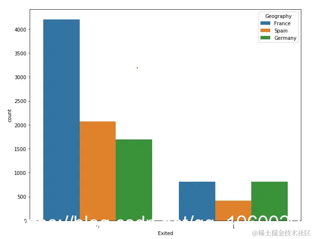 输出显示,在我们的数据集中,有20%的客户离开了银行。这里1代表客户离开银行的情况,0代表客户没有离开银行的情况。让我们绘制数据集中所有地理位置的客户数量: