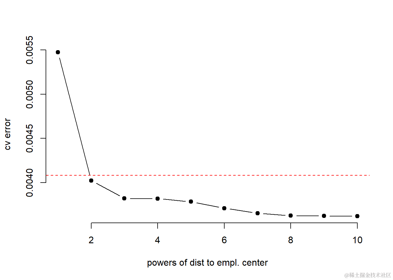 plot(result ~ seq(1,10), type = "b", pch = 19, bty = "n", xlab = "powers of dist to empl. center",