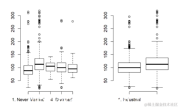 plot(Wage$maritl, Wage$wage, frame.plot = "FALSE")