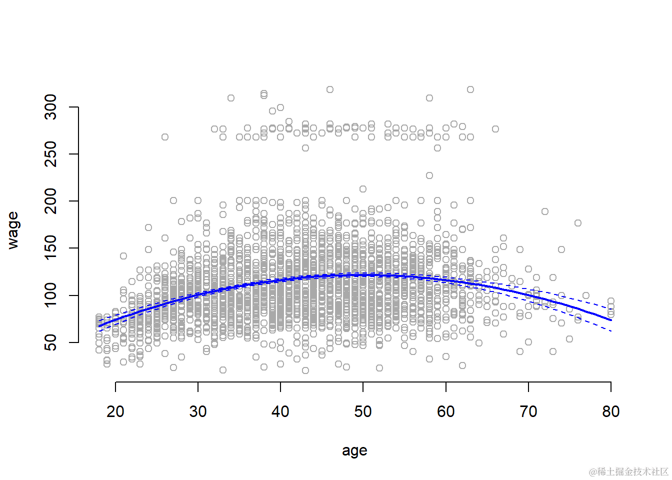 plot(wage ~ age, data = Wage, col = "darkgrey", bty = "n")