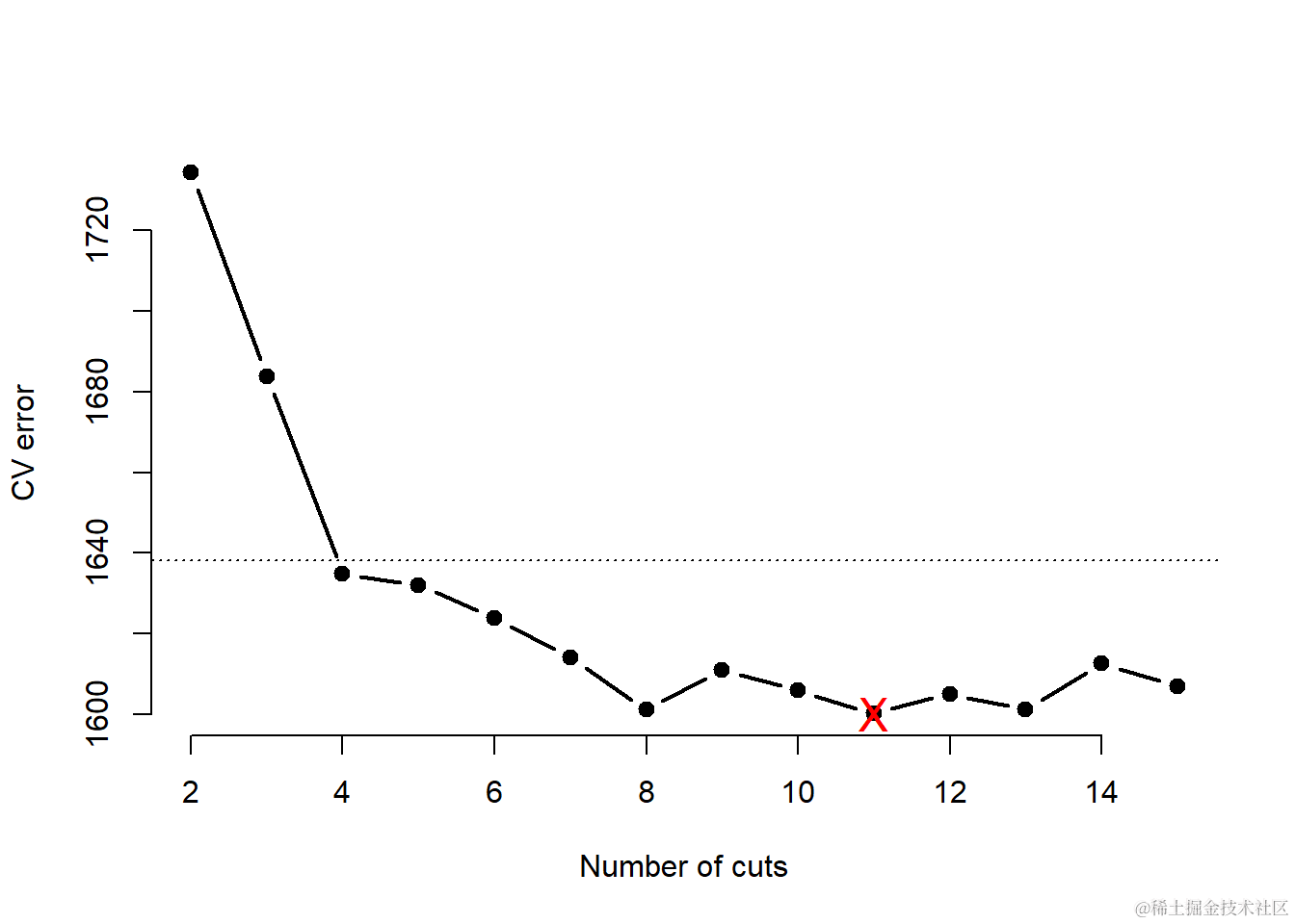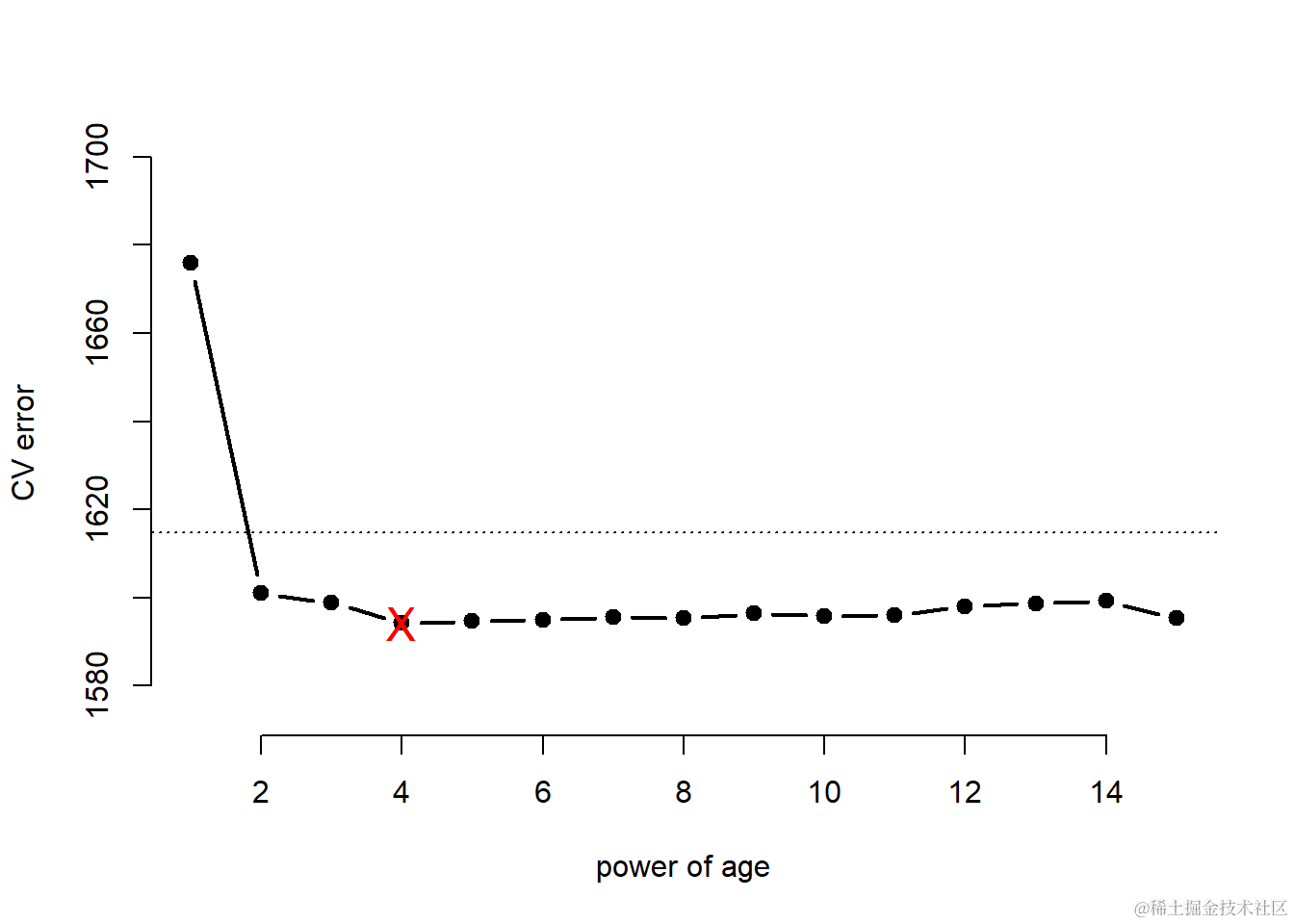abline(h = min(cv.MSE) + sd(cv.MSE) , lty = "dotted")