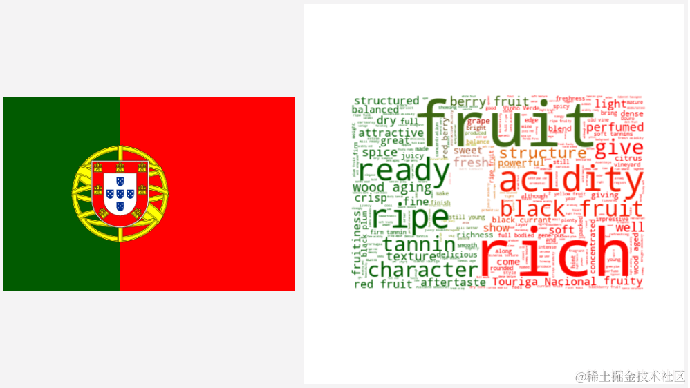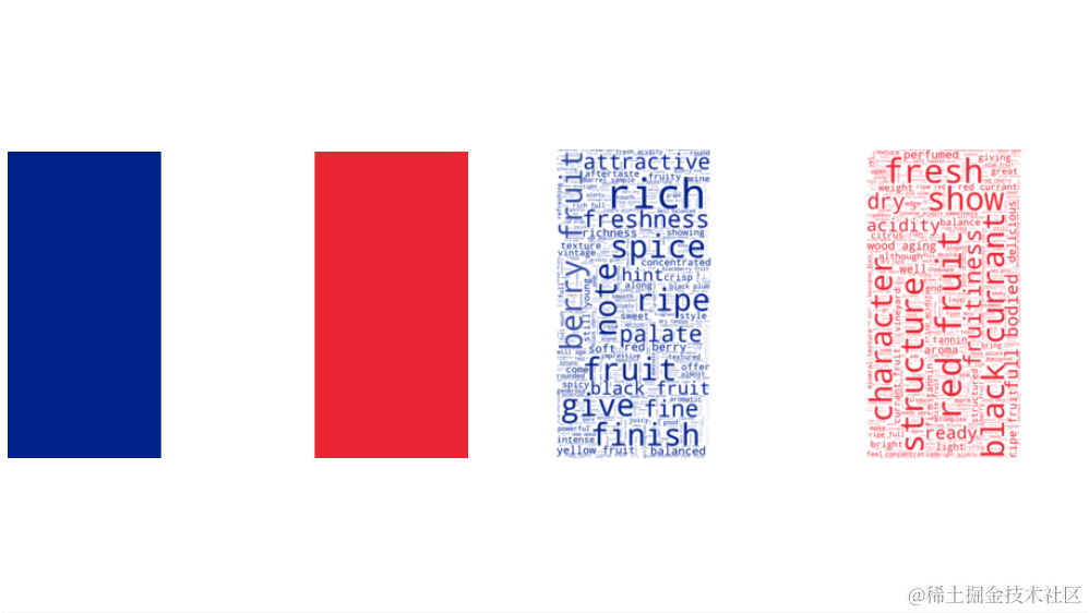 创建了一个酒瓶形状的wordcloud!似乎葡萄酒描述中最常提及的是黑樱桃,水果风味和葡萄酒的浓郁特性。现在,让我们仔细看看每个国家/地区的评论: