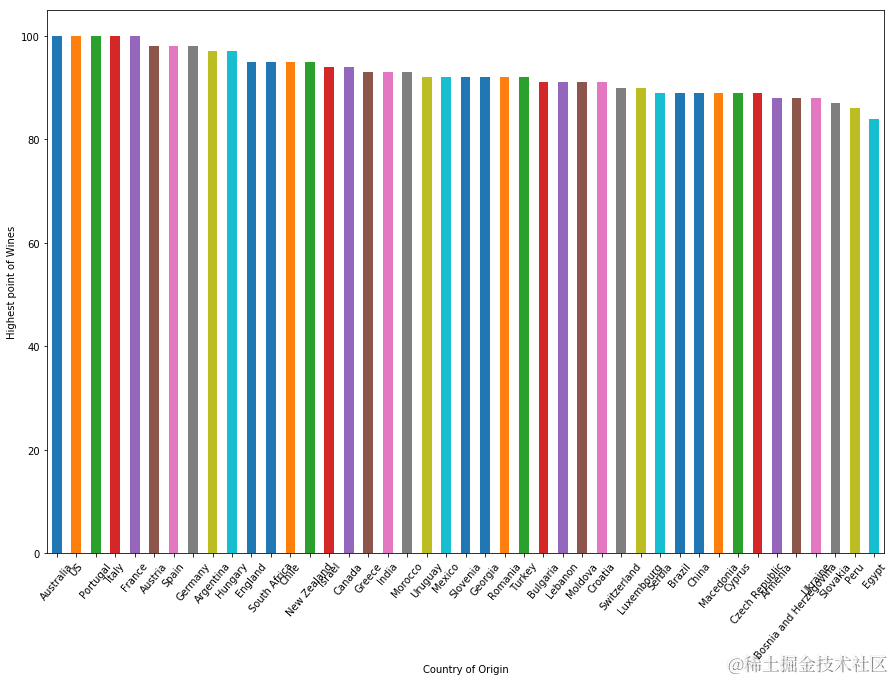澳洲,美国,葡萄牙,意大利和法国都有100分的葡萄酒。如果您注意到,在数据集中生产的葡萄酒数量上,葡萄牙排名第5,澳大利亚排名第9,这两个国家/地区的葡萄酒种类少于8000。