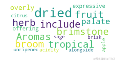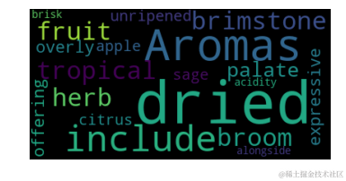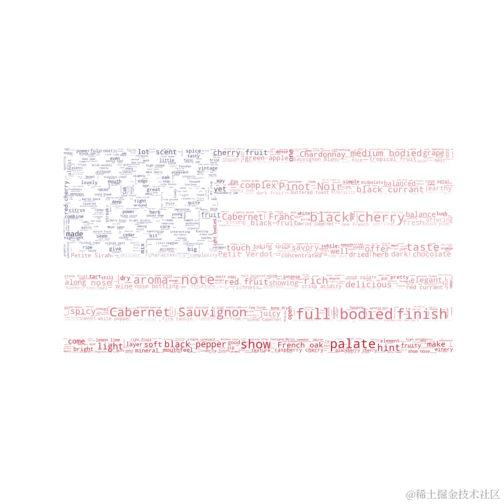 因此,现在您将所有葡萄酒评论合并为一个大文本,并创建一个巨大的胖云,以查看这些葡萄酒中最常见的特征。