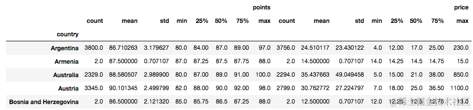 使用葡萄酒数据集,您可以按国家/地区分组并查看所有国家/地区的价格。``