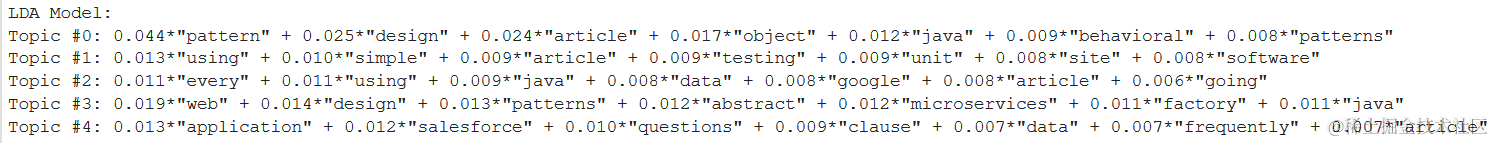 我们可以更改参数中的值以获取任意数量的主题或每个主题中要显示的单词数。在这里,我们想要5个主题,每个主题中包含7个单词。我们可以看到,这些主题与java,salesforce,单元测试,微服务有关。如果我们增加话题数,例如10个,那么我们也可以发现现有话题的其他形式。