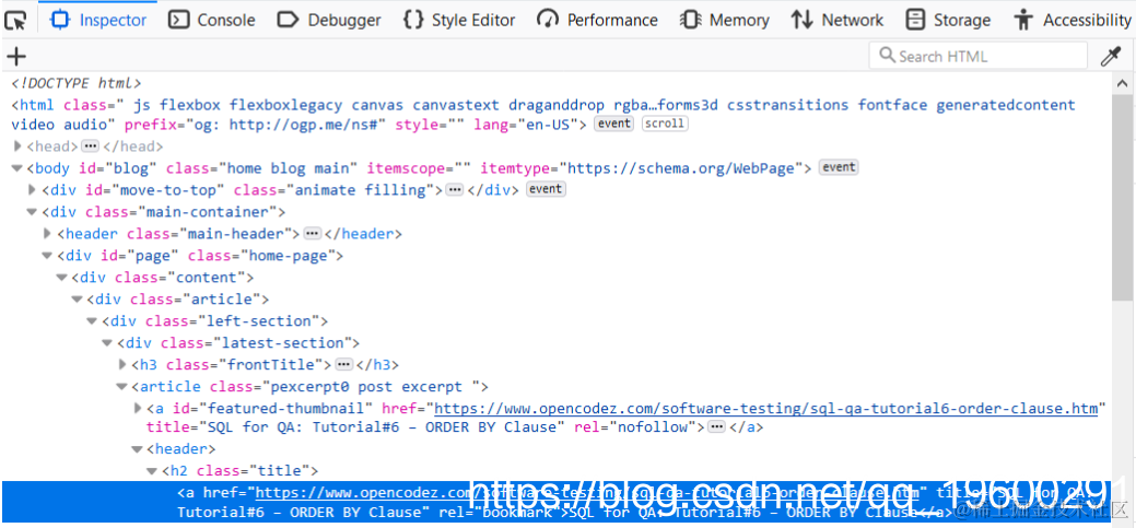 让我们观察必须提取详细信息的页面部分。如果我们通过前面介绍的右键单击方法检查其元素,则会看到href的详细信息以及任何文章的标题都位于标签h2中,该标签带有名为title的类。