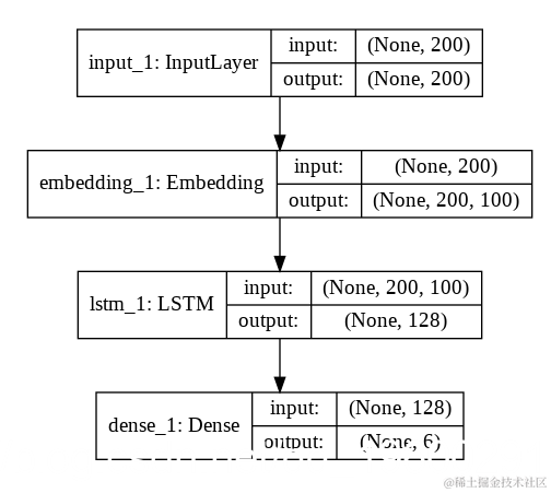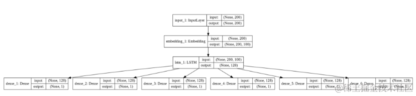 我们的模型将具有一层输入层,一层嵌入层,然后一层具有128个神经元的LSTM层。LSTM层的输出将用作6个密集输出层的输入。每个输出层具有1个具有S型激活功能的神经元。