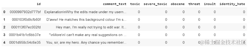 数据集包含159571条记录和8列。数据集的标题如下所示: