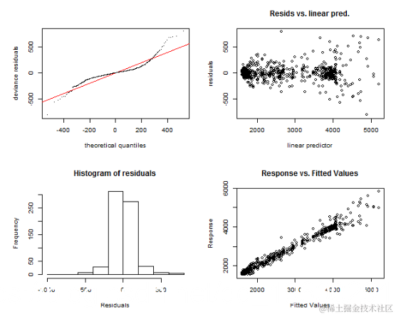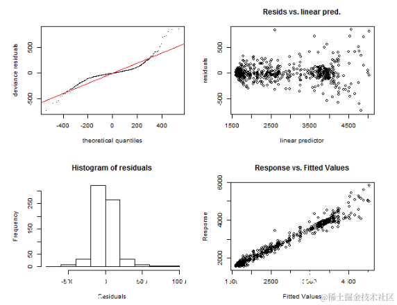 第一个是function gam.check,它绘制了四个图:残差的QQ图,线性预测变量与残差,残差的直方图以及拟合值与因变量的关系图。让我们诊断模型gam_4和gam_6。