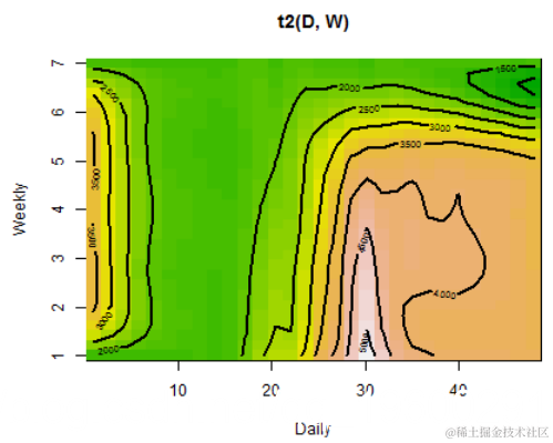 vis.gam(gam_6, main = "t2(D, W)", plot.type = "contour",
