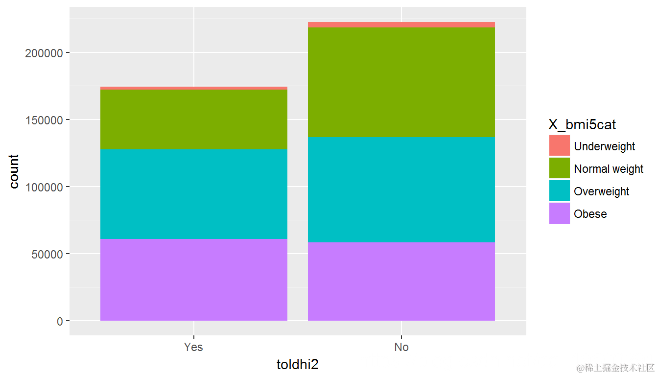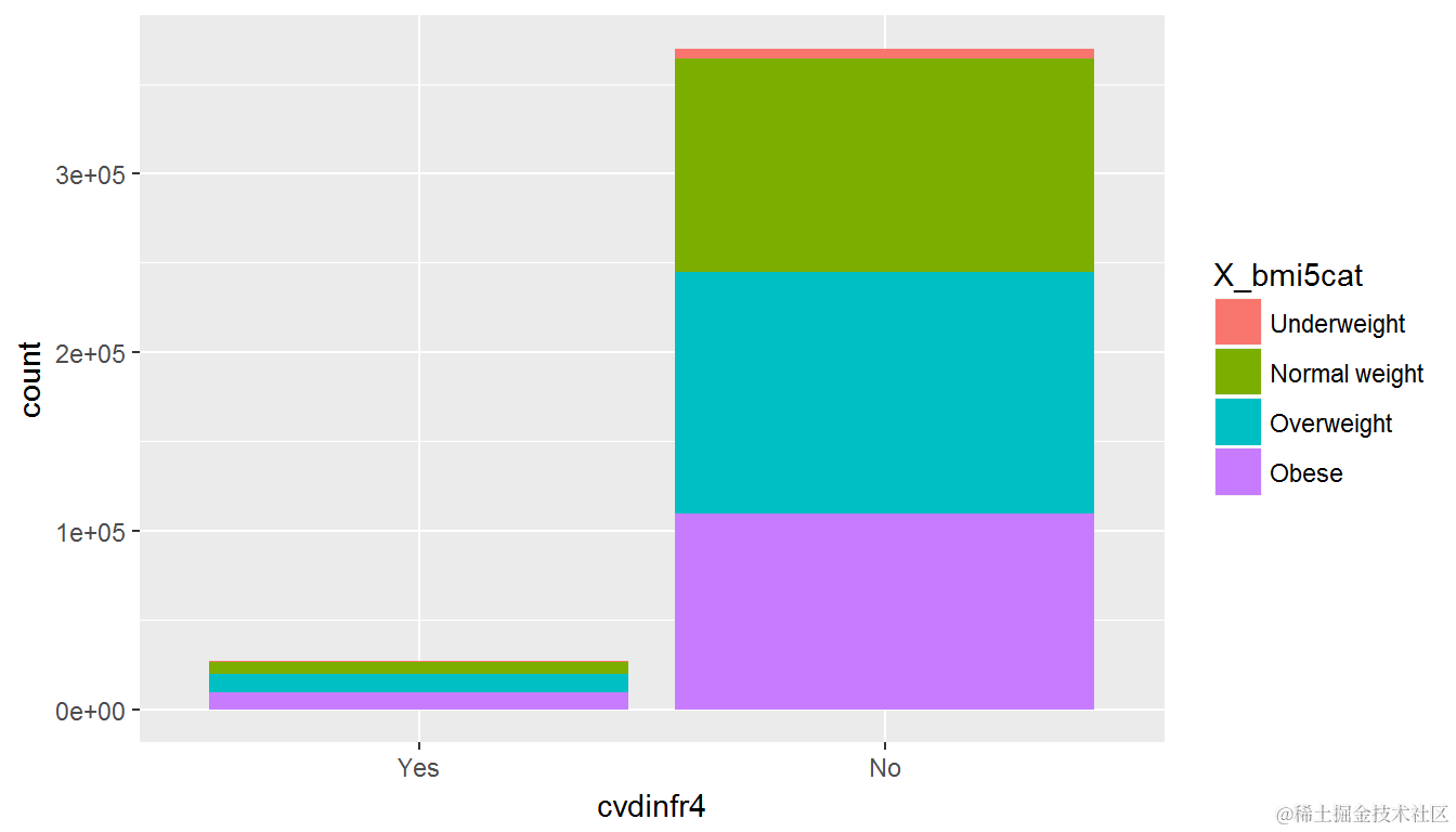 ggplot(data=V3,aes(x=cvdinfr4,fill=X_bmi5cat))+